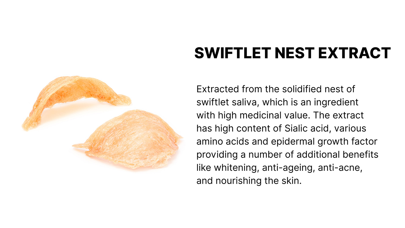 Aqua (Water), Cetyl Alcohol, Isopropyl Palmitate. C12-15 Alkyl Benzoate, PEG-7 Glyceryl Cocoate, Swiftlet Nest Extract, Prunus Lannesiana Flower Extract (Sakura Flower Extract), Aloe Barbadensis Extract, Steareth 2, Steareth 21, Glyceryl Stearate, Ascorbyl Tetraisopalmitate, Phenoxyethanol, Xanthan Gum, Tocopherol, Vitis Vinifera Fruit Cell Extract (Grape Stem Cell), Tripeptide-1, Retinol, Ethylhexylglycerin, , Fragrance (Parfum)