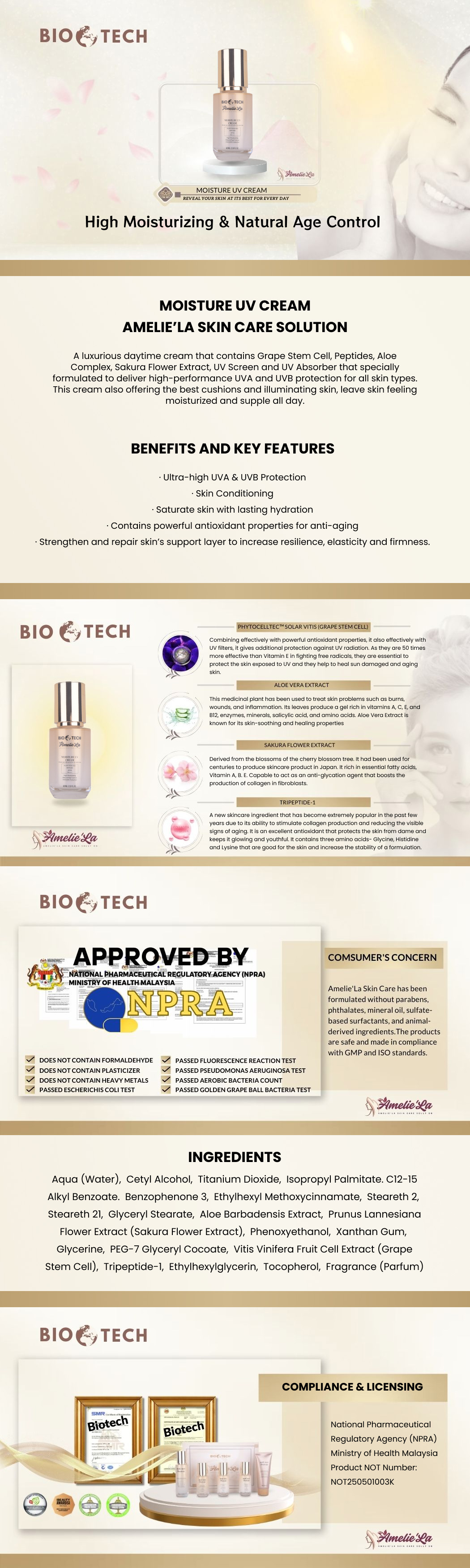 Aqua (Water), Cetyl Alcohol, Titanium Dioxide, Isopropyl Palmitate. C12-15 Alkyl Benzoate. Benzophenone 3, Ethylhexyl Methoxycinnamate, Steareth 2, Steareth 21, Glyceryl Stearate, Aloe Barbadensis Extract, Prunus Lannesiana Flower Extract (Sakura Flower Extract), Phenoxyethanol, Xanthan Gum, Glycerine, PEG-7 Glyceryl Cocoate, Vitis Vinifera Fruit Cell Extract (Grape Stem Cell), Tripeptide-1, Ethylhexylglycerin, Tocopherol, Fragrance (Parfum)